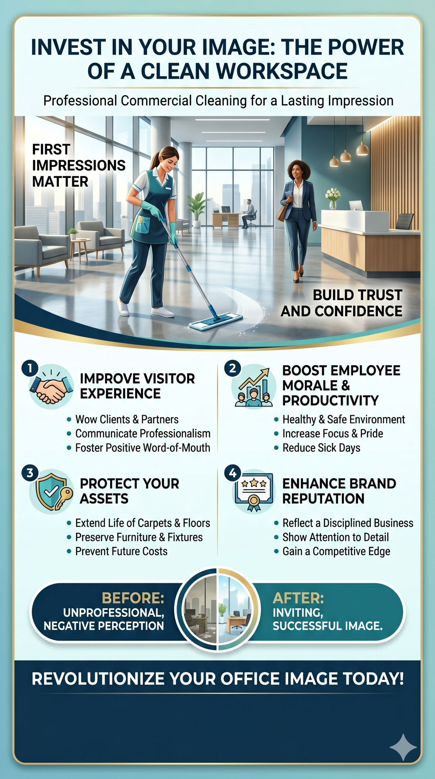 A clean workspace is a silent salesperson. It tells your story before you even say hello. By investing in a consistent, professional cleaning schedule, you aren’t just “tidying up”—you are reinforcing your commitment to excellence.